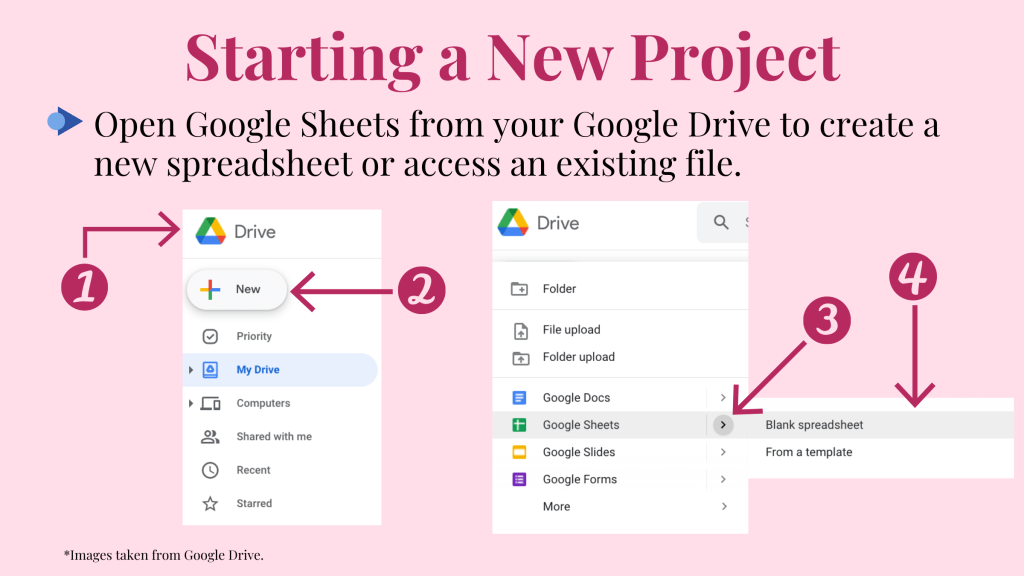 - Click on “Blank spreadsheet” to create an empty/new file or “From a template” to choose from Google’s spreadsheet templates (for budgeting, calendars, grade-tracking, to-do lists, etc.)
