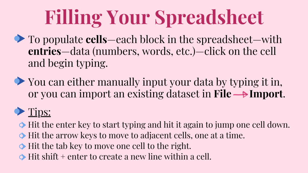 For any other Google Sheets novice like me who works with tabular data and could really use simplified explanations of some of the most commonly-used features on this software, I’ve created a 7-part asynchronous workshop, along with short exercises for practice, that will explain how to organize, analyze, and visualize your data.